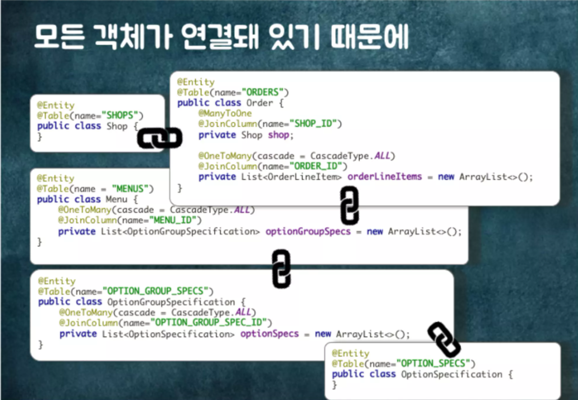 - ๊ฐ์ฒด๋ค์ด ๋ค ์ฐ๊ฒฐ๋์ด์๊ธฐ ๋๋ฌธ์ ๋ชจ๋ ๊ฒ์ด ์กฐํ๊ฐ ๊ฐ๋ฅํ๋ค. ๋ฉ๋ชจ๋ฆฌ์ ์์ ๋๋ ํฐ ๋ฌธ์ ๊ฐ ๋์ง ์์ง๋ง ORM์ด๋ DB๋งคํ์ ํ๋ ์๊ฐ๋ถํฐ ๋ฌธ์ ๊ฐ ์๊ธด๋ค.
