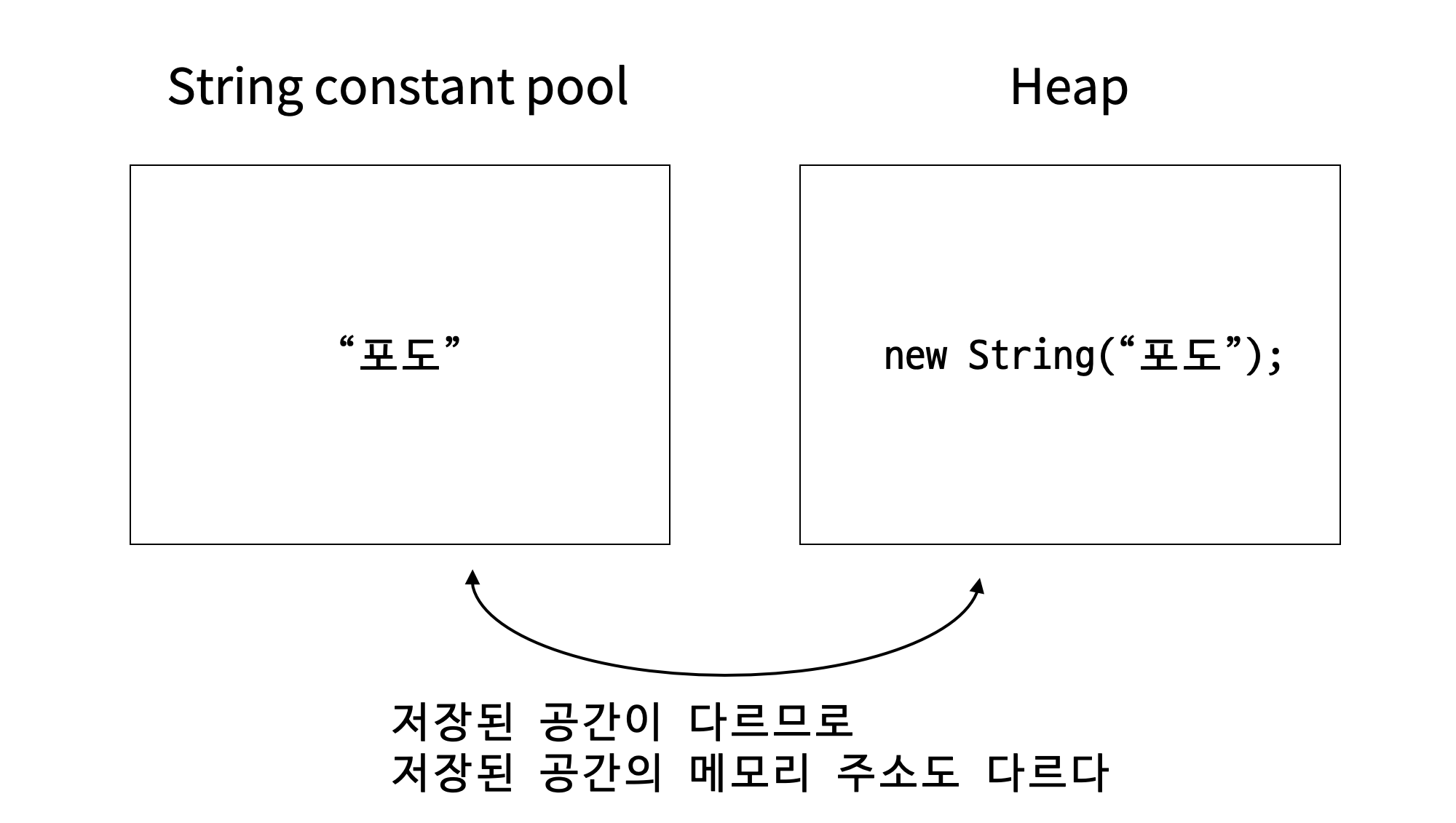 - 또한 String str2 = “i” 를 선언하고 str과 비교를 했을 때에는 두 변수가 같은 주소를 가리키며, String str2 = new String(”i”); 은 다른 주소를 가리킨다.