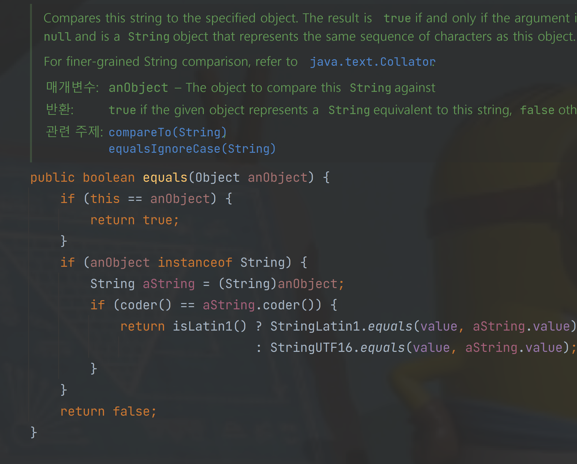 - equals: 원래는 Object의 메서드이다. 기본적으로 객체를 비교하지만 Stirng에서는 오버라이드를 하여 값을 비교한다. 이와 마찬가지로 hashCode 또한 값을 해싱하여 반환한다. 두 개의 String에 값만을 비교해서 같으면 true, 다르면 false를 반환한다.